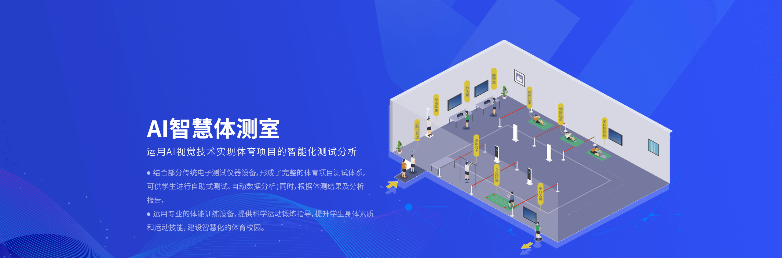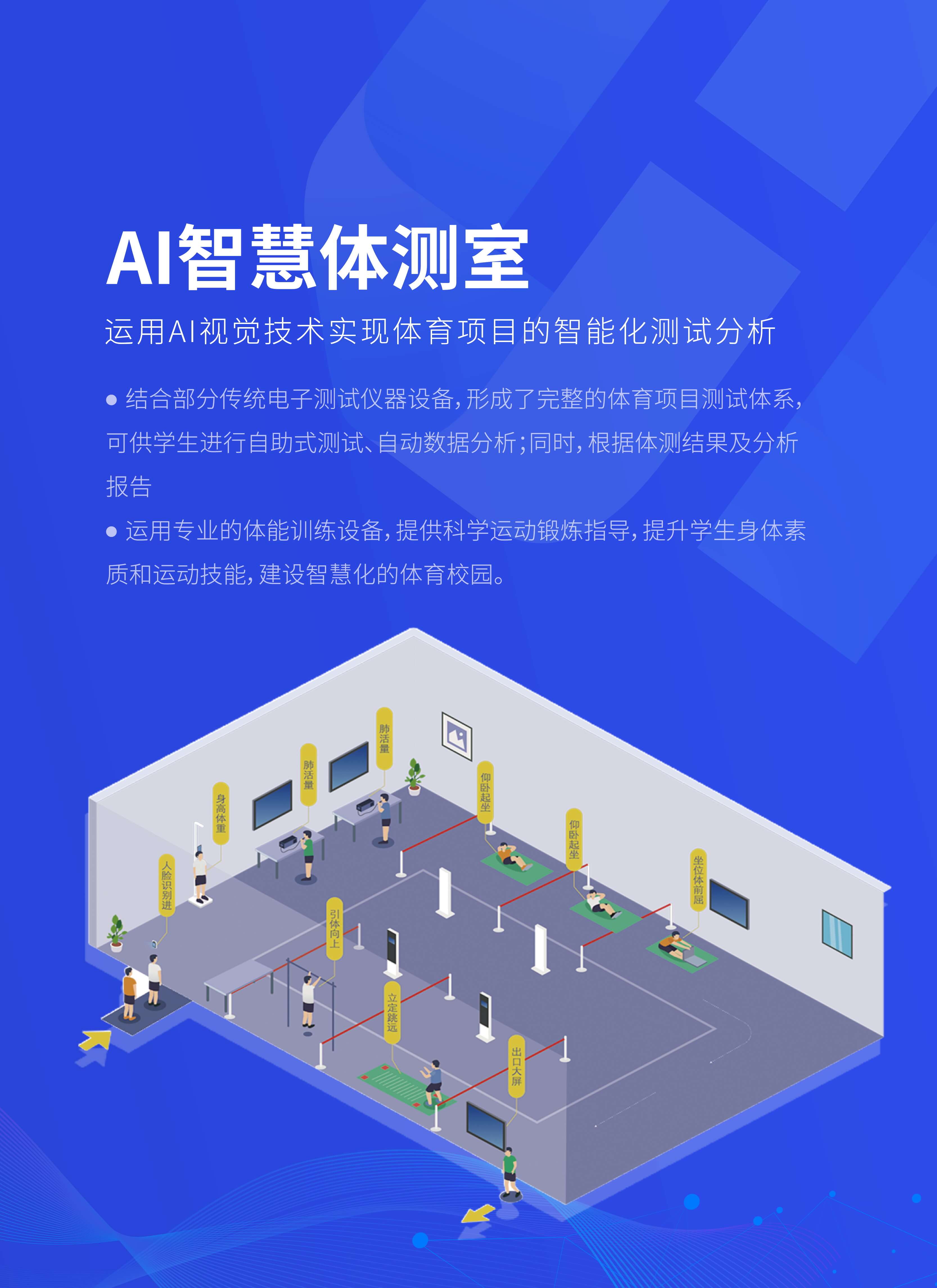智慧体测室是运用AI视觉技术实现体育项目的智能化测试分析。结合部分传统电子测试仪器设备,形成了完整的体育项目测试体系,可供学生进行自助式测试、自动数据分析;同时,根据体测结果及分析报告,运用专业的体能训练设备,提供科学运动锻炼指导,提升学生身体素质和运动技能,建设智慧化的体育校园。