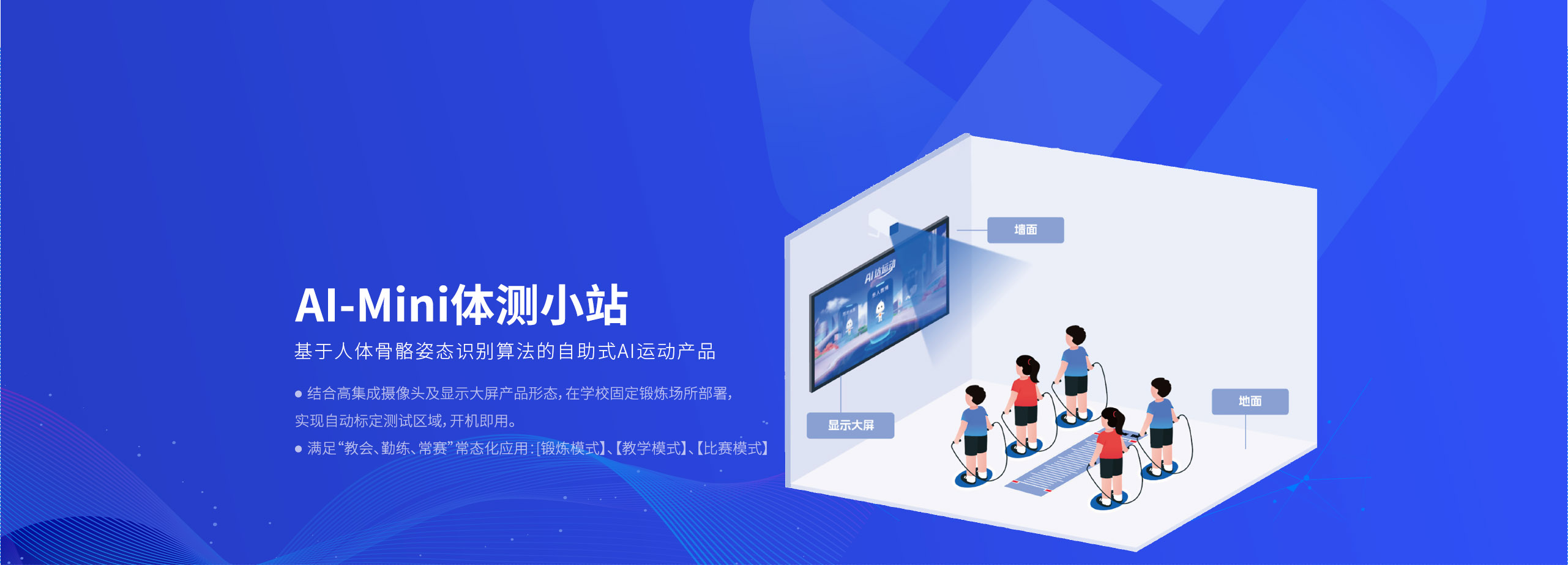 AI-Mini体测小站是一款结合AI高集成摄像头、电视大屏的自助式体测运动产品。设备安装便捷,适用场景广,适用于学校体测室、体育场馆、楼道走廊等场所。产品提供多人跳绳、多人原地纵跳、多人仰卧起坐、立定跳远等运动项目和和趣味对抗运动,提升学生的自主锻炼兴趣。学生通过隔空手势控屏,无感人脸识别;体测小站利用自研A|运动姿态检测算法,自动判定、实时呈现成绩、及荣誉排名记录。产品界面卡通、鼓励声效趣味、人机交互流畅,为校园体育数字化、体测智能化、锻炼常态化提供新颖的运动生态。