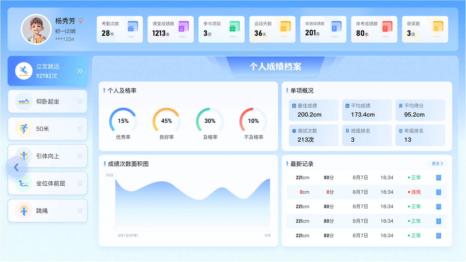 个人数据:AIMini小站学生体质成绩档案:学生个人当前学期,在MINI体测小站上的各项运动总览,运动总时长;体质监测成绩详情,体质报告,运动频率等。并结合国家体质监测标准,统计个人各项运动的达标率。